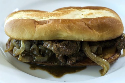 -Slice onions and cook in 1/4 stick butter until soft and light brown. Remove and set aside. -Slice cube steak against the grain. Season with Lawry’s. -Heat 2 TBSP butter over high heat (in same skillet) until melted and beginning to brown. -Add meat in single layer. Cook one side until brown, then flip and cook until brown, about a minute on both sides. -Add 1/2 cup (at least) Worcestershire sauce, 5 to 6 shakes Tabasco, and 2 TBSP butter. Add cooked onions. Stir to combine. -Butter halved French rolls and brown on skillet. -To assemble, lay bottom half of French roll on plate. Place meat mixture, followed by a spoonfull of juice from the pan. Top with other half of roll, cut in half, and devour! And go get on the Stairmaster. Now.