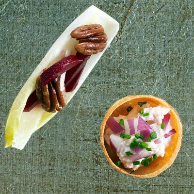 Fill 30 mini phyllo cups with 2 teaspoons each taramasalata (Greek-style carp-caviar spread), finely chopped red onion, and finely chopped chives (bottom right).
