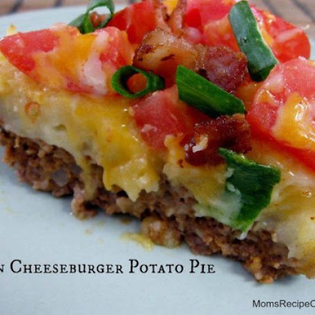Heat oven to 375/F. In med bowl,mix ground beef,bread crumbs, onion,ketchup,mustard and salt. Press mixture in bottom and sides of ungreased 9 in. pie plate. Bake 15 min. In the mean time Prep potatoes. Add 1/2 cup cheese and garlic salt to potatoes. Remove partially baked beef crust from oven; pour off any drippings. Spoon potatoes mixture evenly over crust. Return to oven and bake 15 min. Remove from oven and drain drippings again. Bake another 15 min. Remove from oven and top with tomato,remaining 1/2 c cheese and crumbled bacon. BAke another 5 min longer or until cheese is melted. Remove from oven and top with onion greens. Let stand 10 minutes before serving