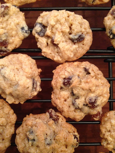 3. Beat butter and sugars till pale and fluffy. Mix in egg and vanilla, then flour mixture. Mix in oats then raisins