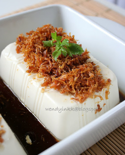 1. Remove tofu from packaging. Place them on serving dish. (I do not like to reheat my silken tofu as I find it is not as soft when the water seeps out, but reheat if you wish to)