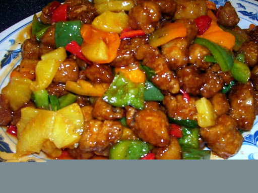 4 Turn the heat to medium and add the remaining 1 teaspoon of cooking oil. Let the oil heat up and then add the bell pepper, onion chunks and ginger. Fry for 1 minute. Add the pineapple chunks and the sweet and sour sauce. Turn the heat to high and when the sauce is simmering, add the chicken pieces back in. Let simmer for 1-2 minutes, until the chicken is cooked through. Timing depends on how thick you've cut your chicken. The best way to tell if the chicken is done is to take a piece out and cut into it. If it's pink, add another minute to the cooking.