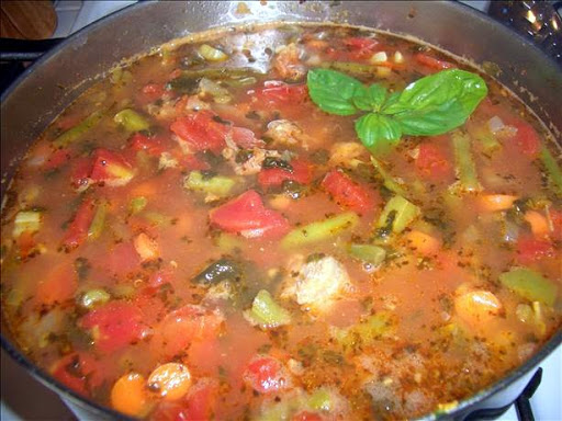 In a large pot; brown the sausage, garlic and onion. Drain off any fat. Add water, beef base, Rotel tomatoes, celery, corn and potatoes. Bring to a boil, cover pan and reduce heat and simmer for about 10 to 20 minutes or until potatoes are done. Stir in parsley and season with salt and pepper to taste. *Can use beef stock in place of the water and beef base if desired.