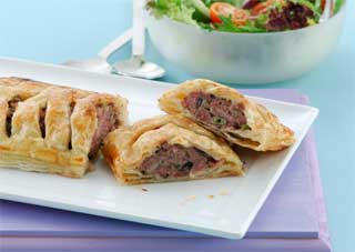 3. On a floured sheet of parchment paper, roll out 1 sheet puff pastry into an 11-by-15-inch rectangle. Spread half of the meat mixture in the center, covering two-thirds of the surface and leaving a 1-inch border along the long ends. Fold in the borders on the long ends and, beginning from a short end, roll up to enclose. Transfer seam side down to a parchment-paper-lined baking sheet; brush with the beaten egg. Repeat with the remaining ingredients.