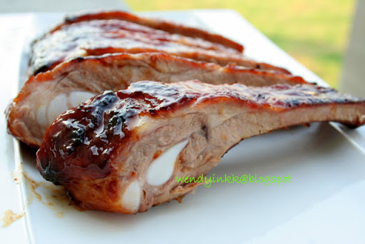 5. When the 25 minutes is up, both sides will look golden. Remove pork rack from oven and generously brush sauce on the rack.