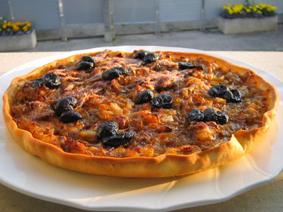 This pissaladière is atypical of most you will find in France where the emphasis is on the onions, not the tomatoes. In fact the majority of the French pissaladières are made without any tomatoes at all! I find this version much nicer.