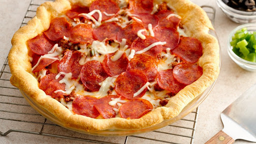 In 10-inch skillet, cook beef over medium heat 8 to 10 minutes, stirring occasionally, until thoroughly cooked; drain. Stir in pizza sauce and bell pepper; simmer 5 minutes. Spoon beef mixture in crust-lined pan; sprinkle with cheese. Top with pepperoni.