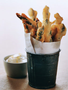 Submerge asparagus spears in batter to coat. Working in batches of 10, drag 1 at a time gently against rim to remove excess batter, then transfer to oil and fry, stirring gently to keep asparagus from sticking together, until golden, 2 to 3 minutes. Transfer as fried with a slotted spoon to a paper-towel-lined baking sheet and keep warm in oven. Return oil to 375°F between batches. Serve with lemon dipping sauce.