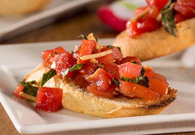 If you prefer, the bread can be sliced first and then toasted to create individual bruschetta. To seed the plum tomatoes, cut them in half lengthwise and gently squeeze to release the seeds.