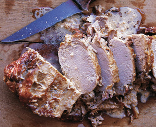 5. Carve the meat and place the pork slices on a warm plate. Pour the pan sauce over the pork and serve. (If you find upon slicing the pork that you’ve undercooked it, slip the pork slices and sauce in an oven cranked to 350°F(176°C) and bake for 5 to 10 minutes, or until cooked through.)