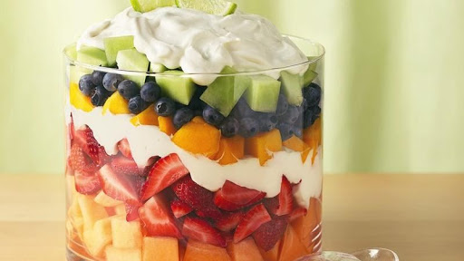A simple and elegant treat with layers of strawberries, melon, mangos and blueberries stacked between and topped off with a sweet creamy lime dressing. Perfect for a crowd pleasing dessert!
