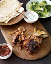 Using forks or tongs, pull the lamb off the bone in large chunks. Using your fingers, pull the meat into smaller shreds and serve with the yogurt sauce, lettuce leaves, naan and the remaining harissa.