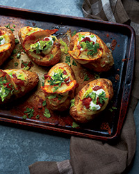 In a small saucepan, heat the vegetable oil to 350º. Scrape the flesh off the reserved 1/2-inch strips of the potato tops. Cut the skins into wedges and fry until golden and crisp, about 2 minutes. Drain the skins on a paper towel-lined plate.