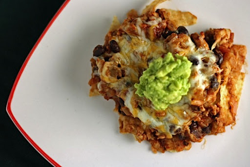 3.Line the bottom of a large baking dish with tortilla chips, pressing down on them lightly to break them into bite-sized pieces. Spread the meat and bean mixture over the chips and top with cheese. Add sliced jalepenos or other toppings that you ant to be cooked. Bake for 20 minutes or until cheese is melted and gooey.