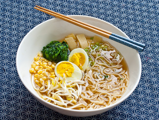 4 Strain the noodles and place in the bowl of broth. Pick up the noodles with chopsticks and fold them over on each other to create a bed for the toppings to sit upon. Repeat with remaining noodles and broth.