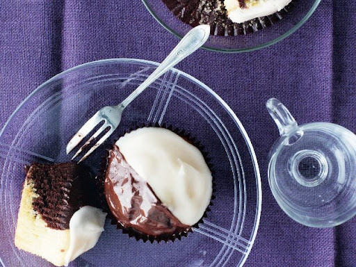 Beat the butter, sugar, and vanilla together with electric beaters until light and creamy. Add the eggs, one at a time, beating well after each addition. Fold in the flours alternately with the milk. Divide the mixture in half and stir the cocoa through one half of the mixture until well combined. Divide the chocolate mixture evenly into half of the paper liners. Then divide the plain mixture into the other half, so that each liner is filled with half chocolate and half plain mixtures. Bake for 18-20 minutes, or until a toothpick comes out clean when inserted in the middle of a cake. Transfer onto a wire rack to cool.