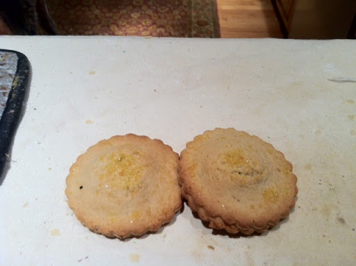 Roll out the dough to 1/9 th inch and cut with a 21/2" round cutter. Optional, you may choose to cut half of the rounds with a decorative cutter such as a heart or star like you would for linzer cookies. To form place 1 tsp filling in center of cookie and place another on the top. With a fork seal the edges.