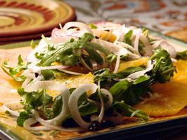 Zest the oranges in strips and reserve for garnish. Slice the oranges into thin rings. Place the orange slices, arugula, fennel, red onions and olives in a large bowl and toss. Toss with the olive oil and lemon juice right before serving. Season the salad with just a touch of salt and pepper. Use the reserved strips of orange zest to garnish the plate.
