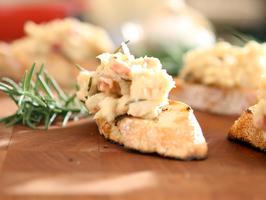 Once hot, add the oil to the saucepan. Add the pancetta and render some of its fat. Add the rosemary and garlic, and saute until fragrant. Stir in the beans, lemon juice and some salt and pepper. Mash the beans with the back of a wooden spoon. Don't mash them all smooth, you want some texture.