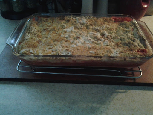 Grease 13x9 in.pan, spread rhubarb in bottom of pan, sprinkle with sugar, jell-o, cake mix.Pour water and melted butter over top, do not mix.Bake in 350 degree oven until rhubarb is done, about 45 minutes.