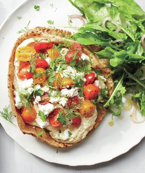Hummus, Tomato, and Feta Pita Pizzas With Arugula Salad