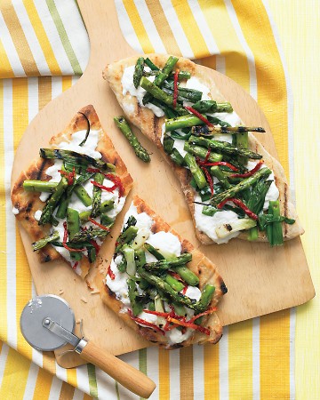 Season asparagus and scallions with the oil from a jar of sun-dried tomatoes, and grill until they are caramelized and tender. Grill ovals of purchased pizza dough before topping each one with ricotta cheese, sun-dried tomatoes, and the grilled vegetables.