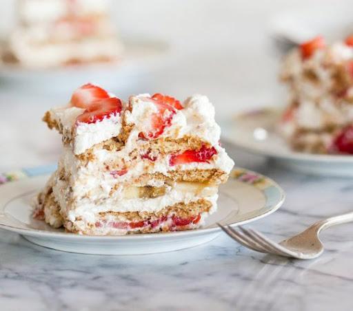 Top with cream and fruit: Top with another quarter of the cream and the remaining fruit. At this point you'll have three layers of graham crackers, three layers of cream, and three layers of fruit.