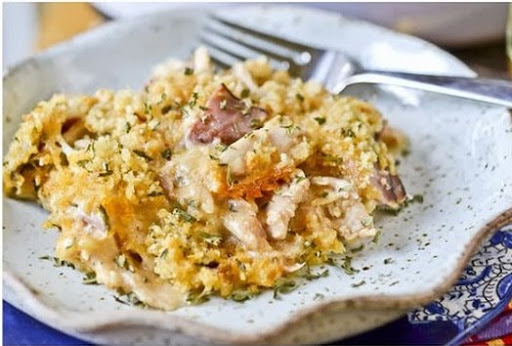 To make the topping: Melt the butter in the microwave in a medium sized microwaveable bowl. Heat it for 30 seconds at a time and stop once it’s melted. Take the bowl out of the microwave and stir in the panko bread crumbs, seasoning salt and crushed dried parsley. Sprinkle over the top of the casserole.