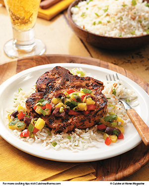Grill pork chops, covered, until edges begin to brown, about 4 minutes. Flip chops and grill until an instant-read thermometer inserted near (but not touching) the bone registers 145°. Remove chops from grill and let rest 3–5 minutes. Serve chops with salsa and rice.