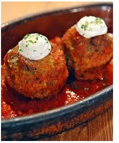 6.Serve: Preheat oven to 350 degrees. Spoon tomato sauce evenly over meatballs and transfer to oven. Bake until heated through, 10 to 15 minutes. Top each meatball with a tablespoon of ricotta cheese (it should look like it is oozing from the center) and sprinkle with Parmigiano; return to oven and heat for 3 minutes.