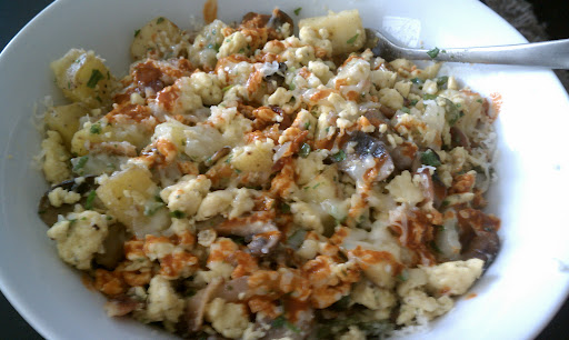 If you can time it right, everything should be done at the same time. Place potatos at bottom of large bowl. Next, sprinkle bacon/sausage pieces evenly amongst potatoes. Finally, place over-easy eggs sunny side up on top and garnesh with parsely flakes (or freshly minced parsely), salt & pepper to taste, and grated cheese if used. Break the yolk before dividing portions.