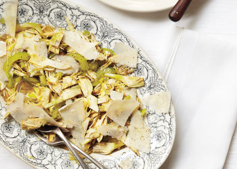 Whisk oil and juice in a medium bowl. Season dressing with salt and pepper. Working with 1 artichoke at a time, break off outer leaves until only pale-green ones remain. Cut 1/2" off the top; trim dark-green parts around stem and heart. Slice lengthwise very thinly and toss in dressing. Repeat with remaining artichokes. Mix in celery and remaining ingredients. Season with salt and pepper. Transfer to a platter and top with cheese