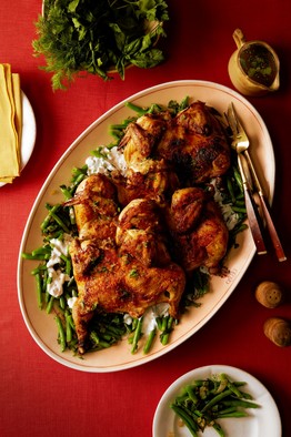 To serve, turn green bean borani out onto a large platter. Pour yogurt over beans. Place hens on platter and drizzle lightly with garlic sauce. Pass remaining sauce in a pitcher.