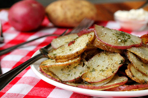 This is the time of year when 10 pound bags of russet potatoes go on sale for super cheap prices. I love it when the price is under $1.00! I just can’t resist buying a bag…and sometimes two bags when I know I can use them. To keep them fresh, I store them in the refrigerator….in one of the vegetable drawers. They come in so handy for dinners when I need to come up with a quick side dish to go along with meat and veggies. Here’s a super quick and easy way to whip up a side dish using potatoes that’s made with herbs and spices right out of the pantry. These baked herb and parmesan potato slices go great with any type of meat. The thinner cut slices get crispy when they’re baked and are soooo delicious right out of the oven! Serves 3