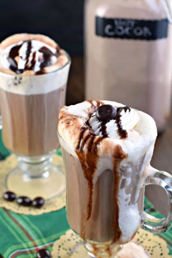 To serve: Add 2 Tbsp hot cocoa mix to two mugs. Pour hot coffee into mugs, and stir until hot cocoa is blended. Slowly pour frothy milk over coffee. Add whipped cream and chocolate syrup, if desired (highly encouraged)!!