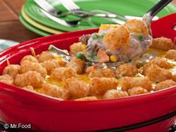 Brown ground beef, onion and salt in a skillet over medium heat, stirring until meat crumbles and is no longer pink; drain. Spoon ground beef into a sprayed 2-1/2 quart baking dish. In small bowl combine soup and milk, mix well. Layer frozen vegetables, soup mixture and cheese over ground beef. Top with frozen potatoes.