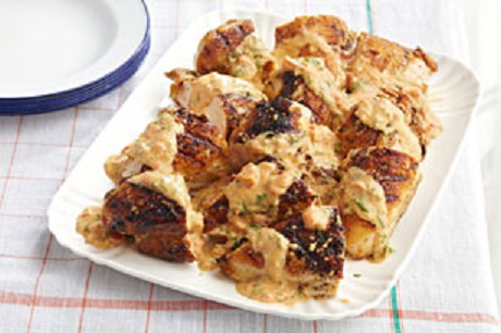 Place chicken, skin sides down, on grate over unlit area; cover. Grill 1 hour or until done (165ºF), turning chicken after 30 min. and placing foil packet over lit area for the last 20 min.