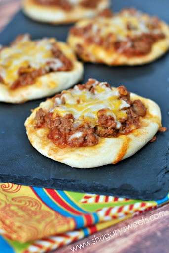 Flatten dinner rolls until about 4 inches in diameter. Place on a parchment paper lined baking sheet. Spoon about 1/4 cup of sloppy joe onto each pizza and sprinkle with cheese.