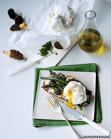 To make these rustic open-faced sandwiches, morel mushrooms and asparagus are simmered with cream, lemon juice, and fresh herbs. The aromatic mixture is then spooned over slices of rustic bread spread with ricotta and topped with a poached egg. They make an unexpected brunch dish or a light dinner.