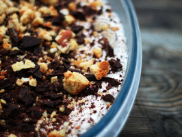 In a bowl, add the mascarpone, chocolate, sugar, and remaining 1/2 cup Vin Santo. Whisk the ingredients together until creamy and thoroughly mixed.