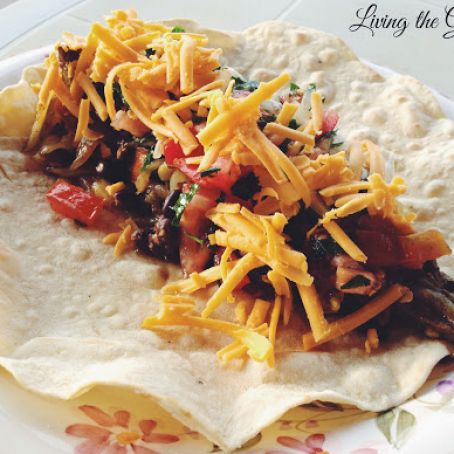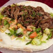Plate the flatbread; fill with the beef followed by the tomato salad, sour cream and finally the shredded cheese; finally fold over and EAT!!
