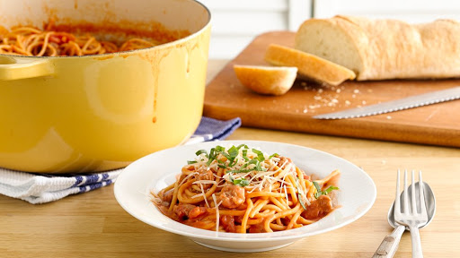 2. Add spaghetti, tomatoes, broth, cream and pepper flakes; heat to boiling. Boil 15 to 20 minutes, turning pasta frequently with tongs or fork, until pasta is cooked and sauce is thick and creamy. Serve with remaining ingredients.
