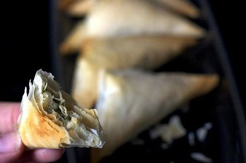 Melt one tablespoon butter in a large heavy skillet over moderate heat, add onions and garlic and saute for a minute, then cook spinach, stirring, until wilted and tender, an additional 4 to 8 minutes (less for baby spinach, more for grown-up spinach). Remove from heat and cool, about 10 minutes. Press mixture in mesh colander (or wring in cheesecloth) to remove as much liquid as possible (I find this more necessary with baby spinach than the heartier stuff, which left almost no excess liquid), then coarsely chop. Transfer to a bowl and stir in feta and lemon juice. Season with salt and pepper to taste. Let filling cool and follow instructions for phyllo triangles.