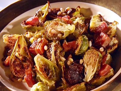 Once the sprouts are ready, remove them from the oven and put into a big serving bowl. Add the pancetta, the capers, pine nuts, currants and raisins. Toss and check for seasoning. Serve.