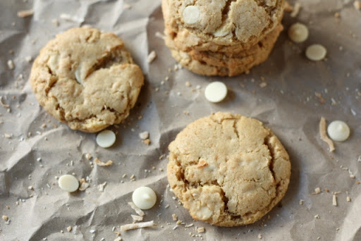 In a separate bowl, combine the flour, baking soda, and salt. Add to the butter mixture and mix until combined. Add the toasted coconut and white chocolate chips and mix until combined.