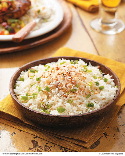 This savory-sweet rice dish makes a natural side for the Brazilian pork chops. Rinse the dry rice until it runs clear to keep it from clumping.