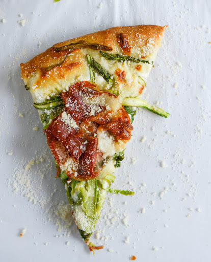 Brush the pizza dough with the olive oil. Spread the whipped ricotta evenly on top, then cover with the grated cheese. Add the asparagus on next and space out the prosciutto slices. Bake the pizza for 35 minutes (baking sheet) or 15 minutes (pizza stone). Remove and cover with a sprinkling of parmigiano reggiano. Let sit for a few minutes before slicing.