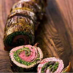 5 Spread a thin layer of pesto on the meat, leaving about 1/2 inch free on all sides of the meat. Lay down the bacon against the grain of the beef. Preheat the oven to 350°F.