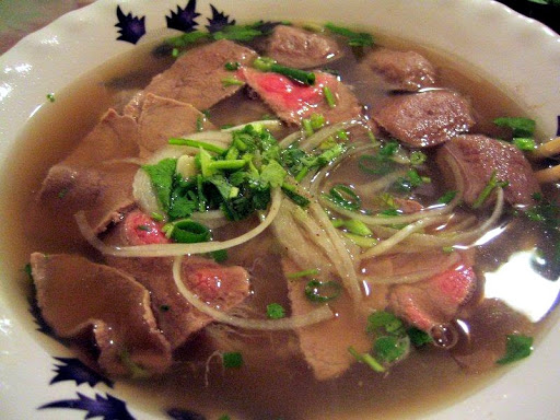 10 In each bowl, place 3oz cooked noodles, 1 oz thinly sliced white onion, 2oz thinly sliced raw eye round steak, 12oz broth. Hot broth, when spooned into the bowl, will cook the raw eye round slices.