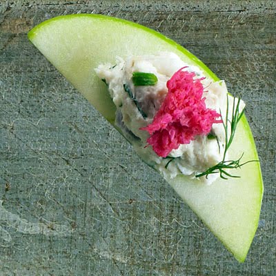 Top 30 Granny Smith apple slices evenly with a mixture of 4 ounces skinless smoked trout, 1/2 cup 1/3-less-fat cream cheese, 2 tablespoons each fresh lemon juice and chopped red onion, dill, and chives. Garnish with horseradish with beets and dill.